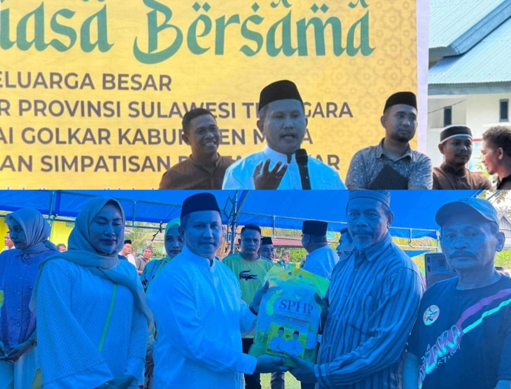 DPD Partai Golkar Sulawesi Tenggara berbuka puasa bersama masyarakat Tongkuno Raya, Kabupaten Muna, Jumat (13/3/2026). Silaturahmi ini, juga menyertakan penyaluran 500 paket beras bagi warga sekitar. Langkah ini, merupakan bentuk kepedulian partai berlambang beringin tersebut di bulan Ramadan.